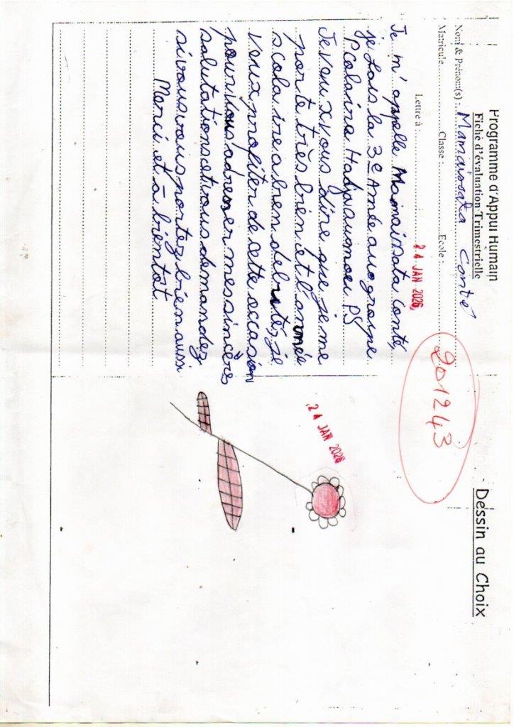 Popis situace: Mama Aissatin otec měl v roce 2017 vážné zranění, kvůli kterému musí nyní zůstat doma, a které mu nedovoluje dále vykonávat práci mechanika jako předtím. Je zoufalý ze svého zdravotního stavu, ale také z toho, že kvůli nižším přímům jeho dcera bude možná muset opustit školu, jelikož nejsou peníze na školné.